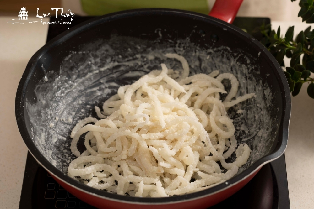 Đây là khâu quan trọng nhất trong cách làm mứt dừa. Bạn nên sử dụng một chiếc chảo rộng, đế dày để nhiệt lan tỏa đều. Đổ toàn bộ dừa và nước đường vào chảo, đun ở lửa lớn cho đến khi nước đường bắt đầu sôi thì hạ xuống lửa vừa.