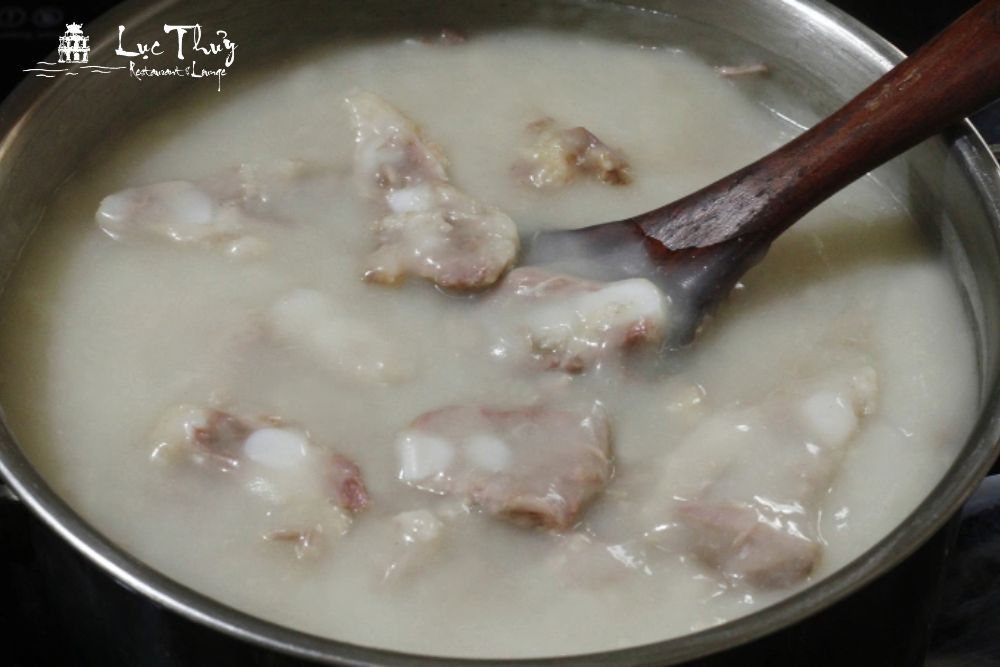 - Nấu cháo: Cho gạo đã xay nhuyễn vào nồi nước dùng xương đang sôi lăn tăn. Khuấy đều để gạo không bị lắng và dính đáy nồi.