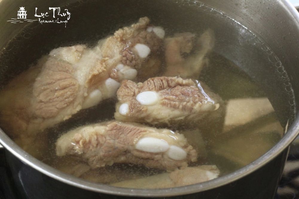 - Ninh xương sườn: Cho sườn đã sơ chế vào nồi cùng 2.5 - 3 lít nước lọc. Đun sôi, sau đó hạ lửa nhỏ và hớt bọt liên tục để nước dùng được trong.