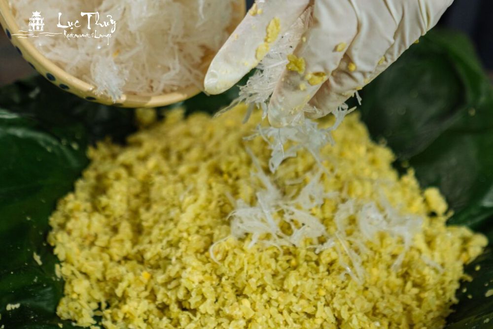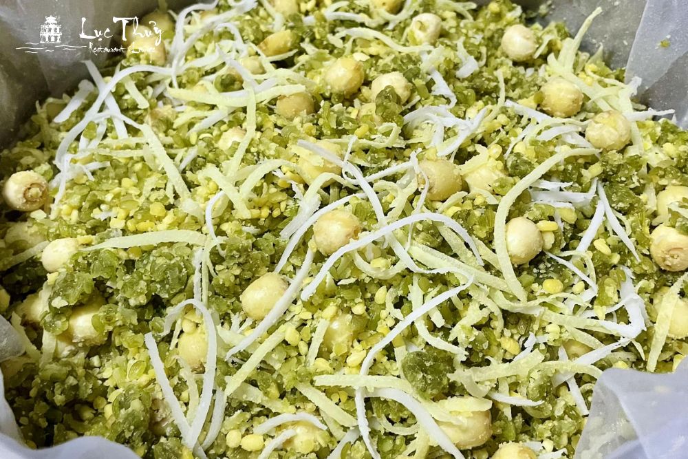 Bước 3: Trộn hoàn thiện: Thêm phần đậu xanh còn lại, dừa nạo và hạt sen. Trộn thật nhẹ tay để không làm nát hạt sen và giữ màu xanh tự nhiên của cốm. Sau khi trộn xong, hỗn hợp đã gần như hoàn thiện và sẵn sàng để ủ hoặc hấp tùy theo loại cốm bạn dùng.