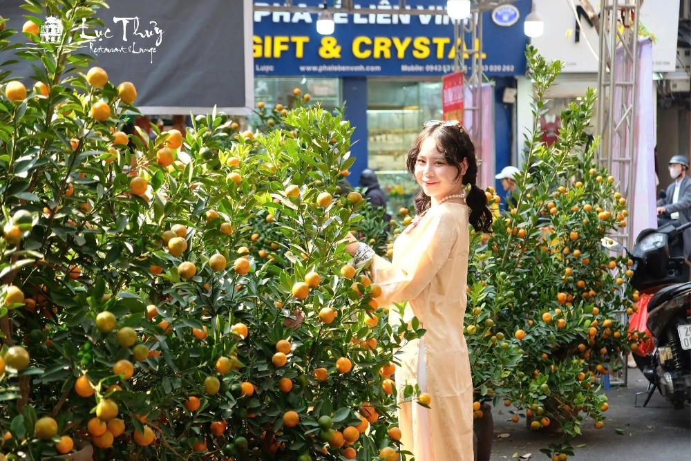 Bước vào không gian của chợ hoa Hàng Lược, điều đầu tiên chiếm trọn trái tim thực khách là sắc hồng nồng nàn của những cành đào Nhật Tân. Đào ở đây thường được tuyển chọn rất kỹ, từ những cành đào dăm nhỏ nhắn để đặt trên bàn thờ gia tiên đến những gốc đào cổ thụ xù xì, rêu phong mang dáng dấp uy quyền. Xen lẫn giữa sắc đào là những cây quất cảnh trĩu quả, tán tròn đều tăm tắp, tượng trưng cho sự sung túc và may mắn. Người bán hoa ở Hàng Lược cũng có phong thái rất riêng – thong dong, nhẹ nhàng và luôn sẵn lòng chia sẻ về cách chăm sóc hoa sao cho nở đúng mùng Một Tết.