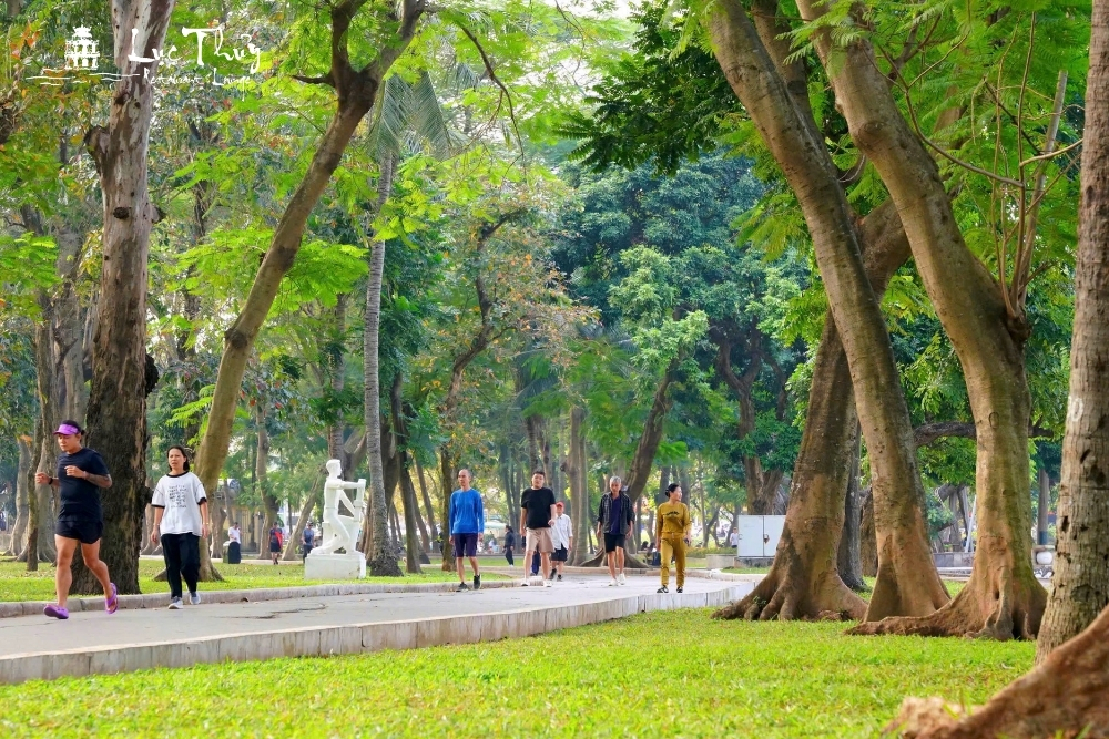 - Hàng cây cổ thụ: Những tán cây sao đen, cây sấu cổ thụ xòe bóng xuống mặt hồ tạo nên một dải xanh mướt mắt quanh năm. Đây là cung đường dạo bộ ưa thích của các cụ già vào mỗi sáng sớm và là nơi tập kết của các hội nhóm đạp xe quanh hồ.