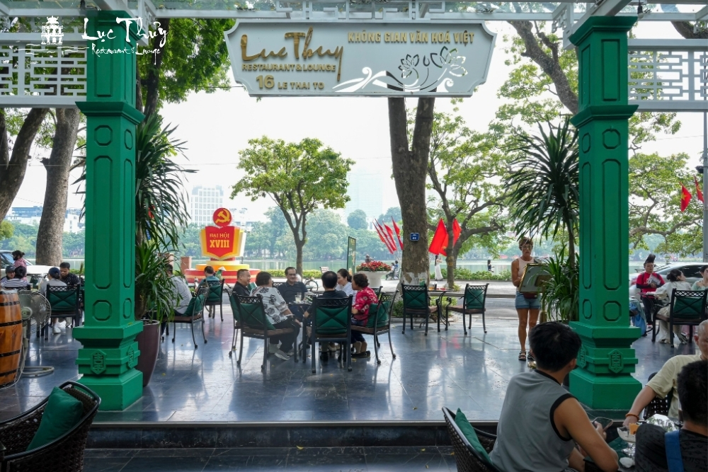 Điểm thu hút đầu tiên và mạnh mẽ nhất của Lục Thủy chính là vị trí địa lý không thể đắt giá hơn. Tọa lạc tại số 16 Lê Thái Tổ, nhà hàng sở hữu khoảng không gian mở nhìn thẳng ra Tháp Rùa và Đền Ngọc Sơn – những biểu tượng linh thiêng của Hà Nội.